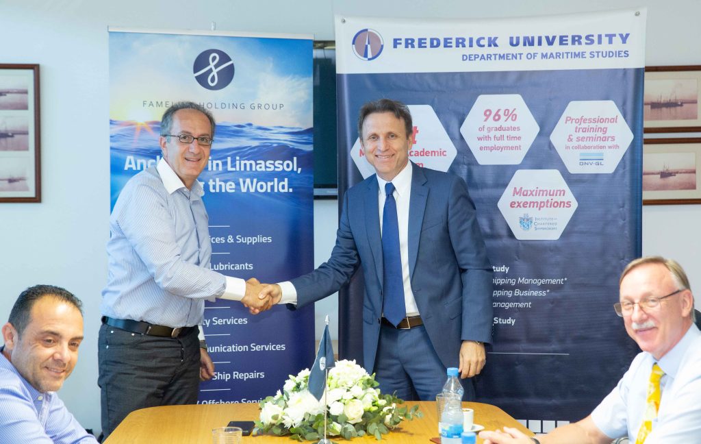 MOU WITH FREDERICK UNIVERSITY Limassol, Cyprus, 27th of June 2019 – Fameline Holding Group (FHG) has signed an MOU with Frederick University at Fameline Building, on the 27th of June 2019. FHG will award every 2 years a full 4-year scholarship to an undergraduate student of Maritime Studies. The scholarship has a socio-economical character where blended with academic […]